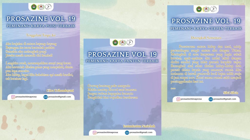 Prosazine Vol. 19 telah terlaksana dengan sukses pada periode 6 Oktober hingga 30 November 2025. Sebanyak 37 peserta mengirimkan karya dalam beragam kategori, meliputi puisi, cerpen, pantun, poster, quotes, dan esai. Seluruh karya kemudian melalui proses kurasi oleh panitia dan dinilai oleh tim juri untuk menentukan satu karya terbaik dari masing-masing kategori. Hasil penilaian menetapkan para peraih Karya Terbaik sebagai berikut: